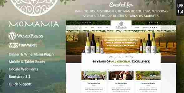 Momamia es un theme reponsive para WordPress que cuenta con un diseño muy fresco y profesional pero tiene menos funciones que los demás themes de WordPress que te hemos enseñado. Cuenta con soporte para Vinos, Blog y Tienda online implementada con WooCommerce. Aun así, el diseño que brinda esta plantilla es precioso. Su precio es de 59$